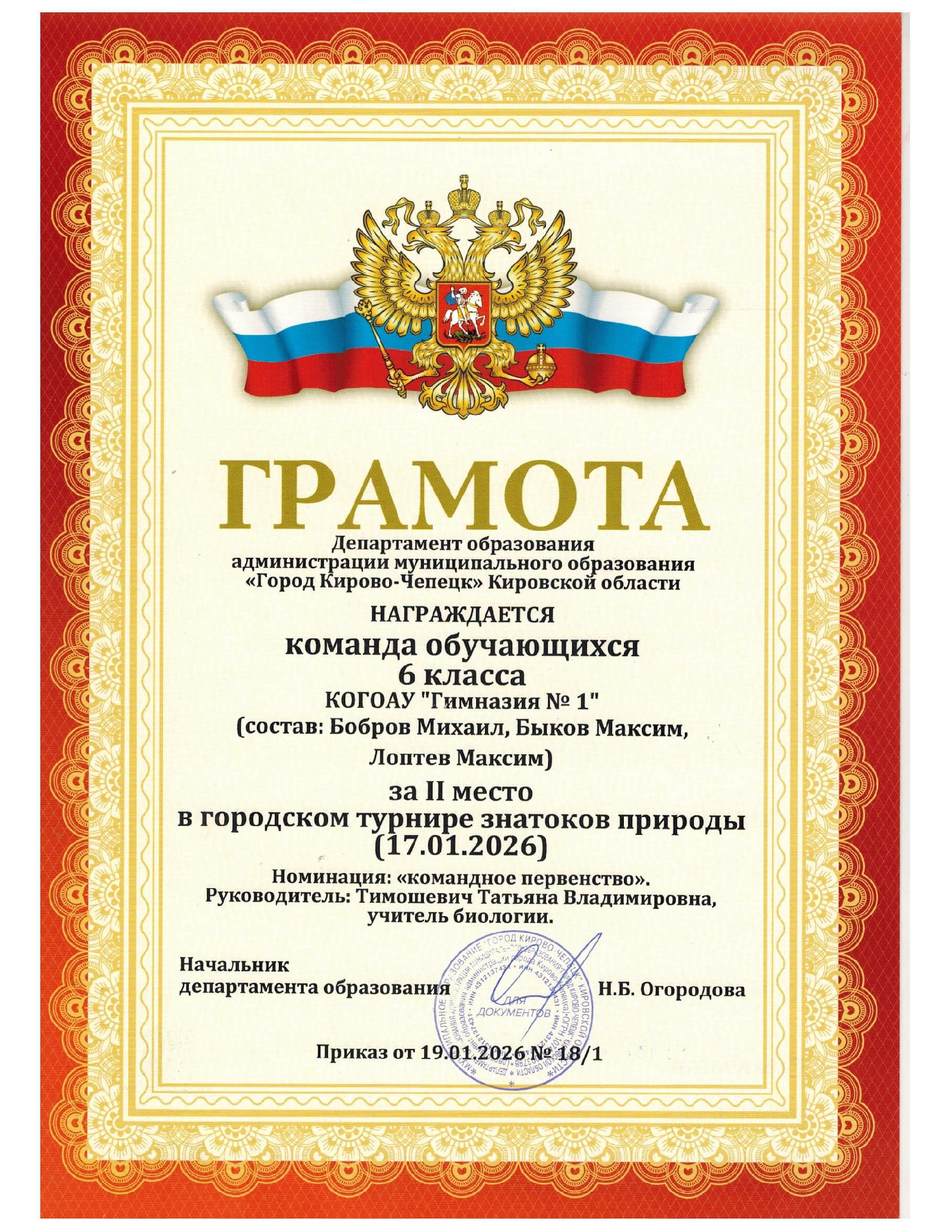 2026 2 место знатоки природы 6 класс